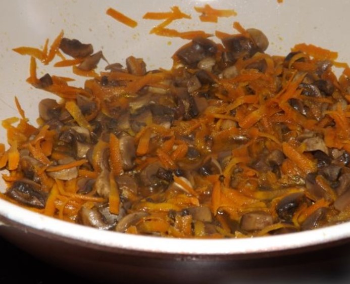 Rub the carrots on a coarse grater, fry with the addition of olive (vegetable) oil. Then add the diced mushrooms (I had champignons) and fry for 10-15 minutes. We spread it on the potatoes.