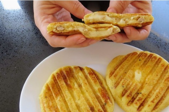 Form a small cake from the potato “dough”. Put the minced meat and some grated cheese in the center of the cake. (By the way, you can use any filling: the sausage that you have left, boiled chicken, or a baked piece of meat – cut and use for the filling. The only thing is that the filling must be ready.)
