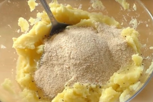 Add the breadcrumbs. Depending on how watery or starchy the potatoes are, add the required amount of crackers. Mix everything well.