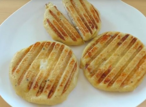 Fry potato zrazy in a pan with a little vegetable oil on both sides until a delicious crust. (Today we use a grill pan for frying.) Just wait for the cheese to melt, and we no longer cook.