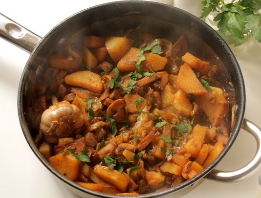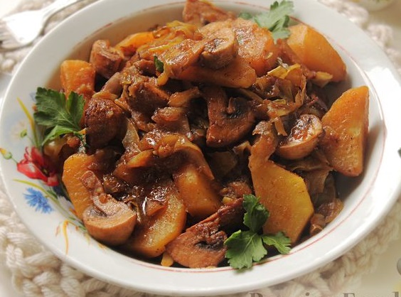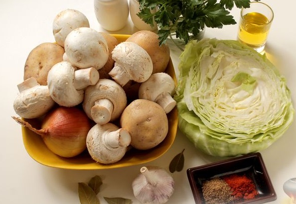 Even without meat, lunch or dinner can be prepared hearty and thorough. Potatoes stewed with cabbage and mushrooms are a wonderful confirmation of this. Thanks to the step-by-step frying of vegetables and mushrooms, the dish turns out to be rich and aromatic. And add more garlic, it will give the vegetables an amazing taste.