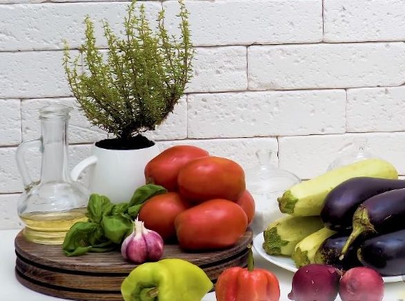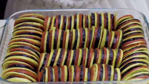 Ratatouille or Provencal vegetable stew. I am sharing with you a simple, tasty, and very healthy recipe. Beautifully laid out circles of zucchini, eggplant, and tomatoes, and under them lies a juicy sauce that makes ratatouille fragrant and incredibly tasty.