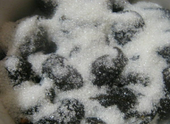 Wash the prunes well, soak in warm water. Remove pits from prunes. Peel the walnuts. Divide the walnuts into halves, carefully fill each plum with a nut. Put the prepared plums in a saucepan. Sprinkle the plums with sugar to taste.