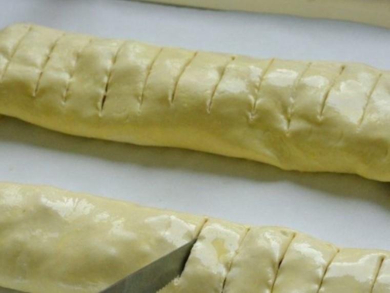 Make small cuts on top with a sharp knife. Send the roll to the preheated oven.