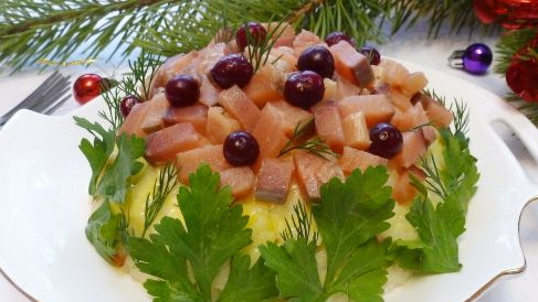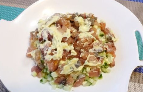 Anyone who loves Japanese cuisine will love this flaky salad with salted red fish, rice, and fresh cucumber. Light, with a pleasantly mild taste, the salad is just perfect for a festive table.