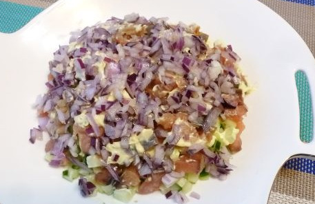 The third layer is red fish and mayonnaise.