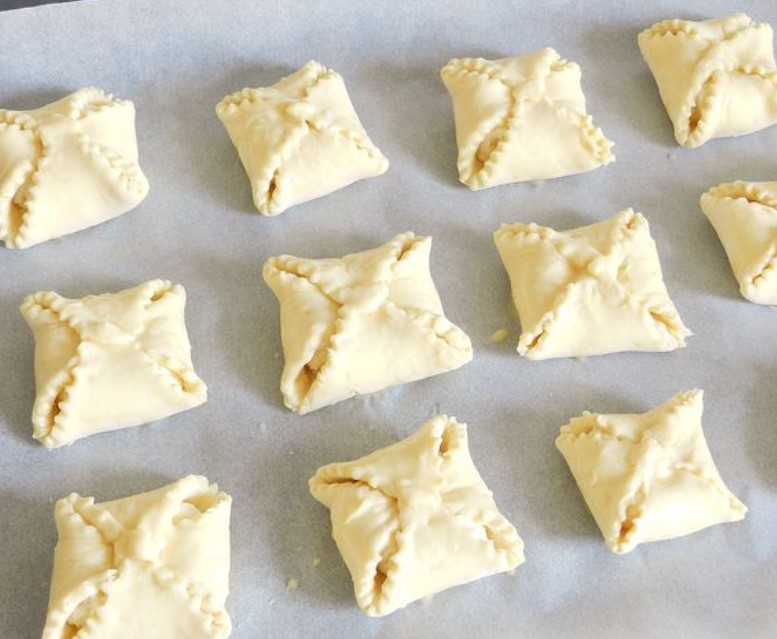 Put a tablespoon of the lemon curd filling in the center of the square. Connect opposite corners of the square above the filling. To prevent the puff from falling apart, the dough can be greased with an egg at the junctio