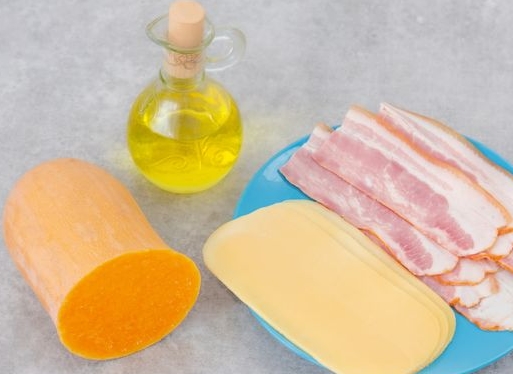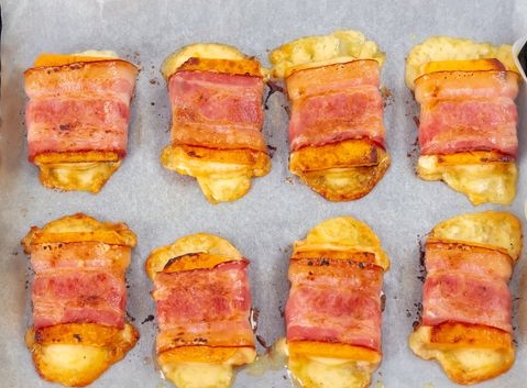 An original quick snack with only four ingredients. Colorful pumpkin slices are lightly toasted and then baked with bacon and cheese. The light sweetness of pumpkin successfully sets off the salty taste of cheese and aromatic bacon. In a few minutes, a bright and unusual snack is obtained. Try it!