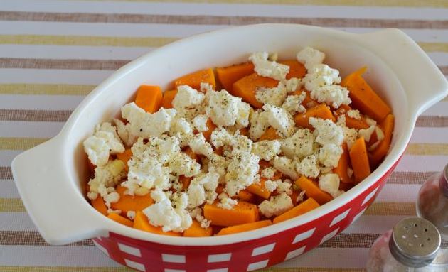 Peel the pumpkin, cut it into small pieces. Grease a baking dish with olive oil. Place the pumpkin in a mold. Peel the garlic and chop finely with a knife. Place the garlic on top of the pumpkin. Crumble the feta cheese and put it in a mold.