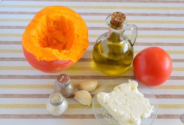 Prepare products for cooking baked pumpkin with tomato and feta. Turn on the oven to heat up to 180 degrees.