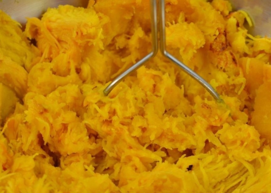 Cut the pumpkin into small pieces, place in the bowl of a food processor and chop until smooth. You can also grind with a mixer.