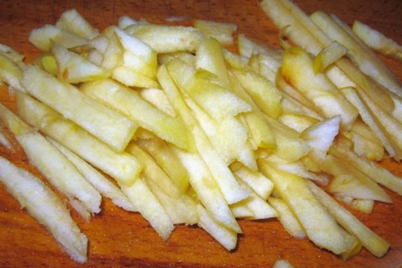 Cut the zest from the lemon and chop it into strips. Peel the apples and cut them into strips.