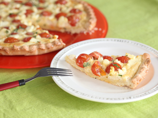 Remove the mold with the base from the oven. Put the leeks and tomatoes on the dough. Pour the egg mixture and top with the sliced cheese. Put in the oven again and bake for another 20-30 minutes – the cheese should melt slightly, and the egg filling should be baked. Cut the finished quiche into 4-6 pieces, serve warm.
