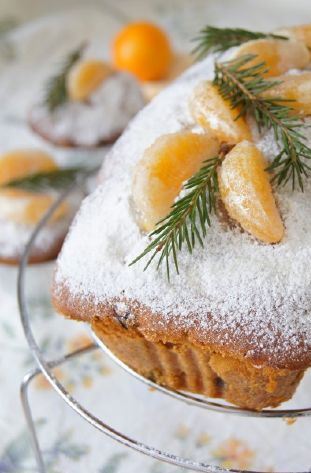 Preheat the oven to 160-170C and bake the Christmas cake for about 1 hour and 20 minutes. Sprinkle the hot cake with icing sugar. Decorate as desired. (Brush the tangerine slices with egg white and sprinkle with powder. Allow to dry.)