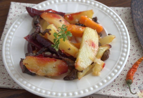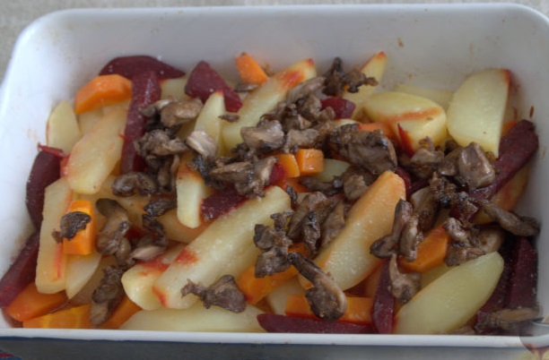 Quick Potatoes in the Oven, with Beets, Carrots and Mushrooms