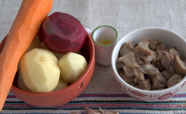 We prepare the ingredients for quick potatoes in the oven-baked with carrots, beets, and mushrooms. Pre-boil the forest mushrooms and cut them into pieces.