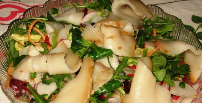 If the fish is a piece, then cut it thinly. Place the fish slices over the radish salad.