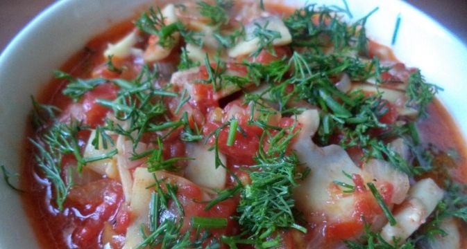 Ragout with mushrooms and tomatoes is a great dish for a festive fast day. It goes well with cereals and pasta.