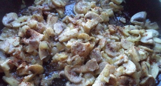 Preheat a frying pan, pour in vegetable oil. Put the onion in hot oil. Fry over medium heat, stirring occasionally, until golden brown (3-4 minutes). Then add the mushrooms. Mix.