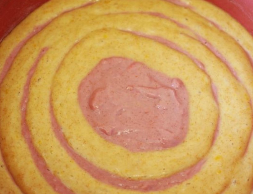 Separate about a third of the total dough and mix with the raspberry puree prepared earlier.