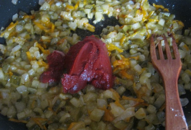Put the tomato paste in the frying pan. Stir to mix everything. Cook for 1 minute.