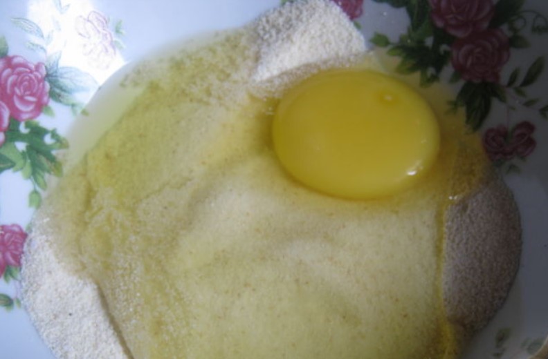 Make kluski. Put the semolina into a bowl and salt. Add 1 egg and mix it.