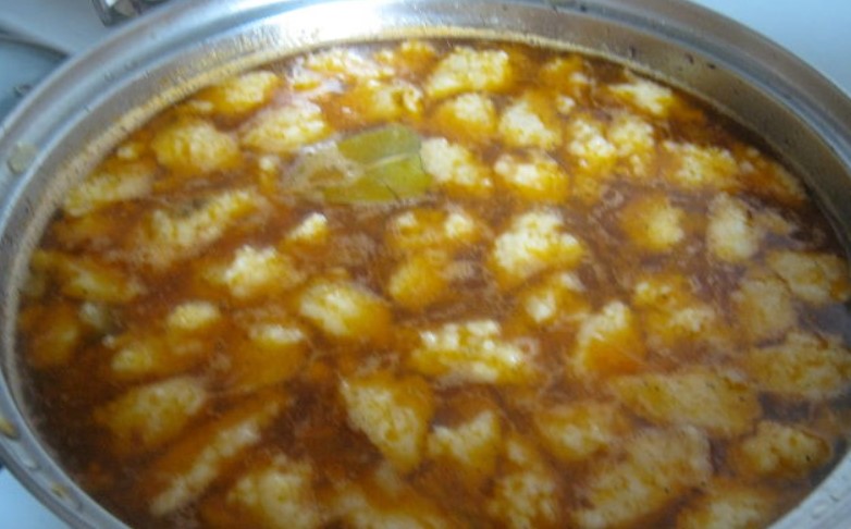 Use a teaspoon to place small kluski into the boiling rassolnik. Bring them to a boil.
