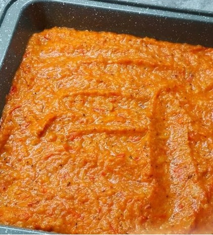 Put the finished sauce in an even layer on the bottom of the baking dish.