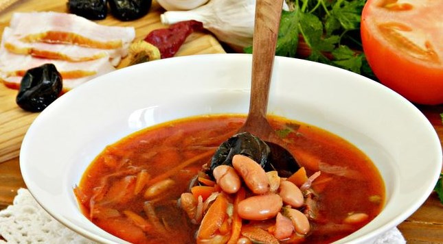 Let the borscht brew for about 30 minutes. Delicious borsch with chicken, beans, and prunes is ready. Enjoy your meal!