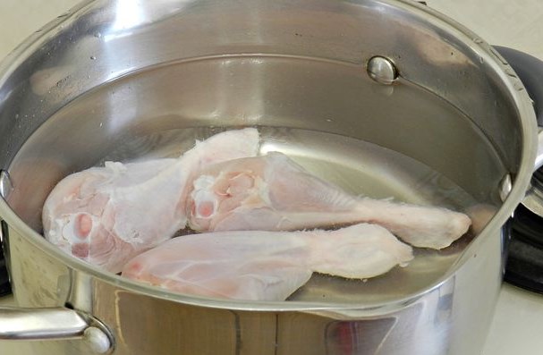 The broth of chicken drumsticks was simmered over low heat with a minimum boil for about 1 hour. Chicken meat is easily pierced with a knife and separated from the bones – which means the broth is ready.
