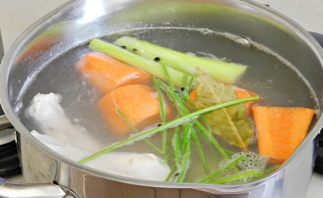 When the water in the pan boils, remove all foam. Dip the onion, carrot, celery stalk, parsley stalks, bay leaf, and peppercorns into a saucepan. Boil the broth under the lid over the lowest heat. The broth should not boil too much to avoid becoming cloudy. If foam forms, it must be removed.