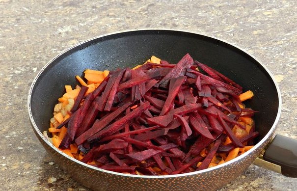 Prepare borsch dressing. Cut the red onion into half rings. Beets and carrots – straws.
