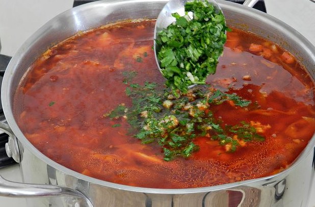 Put the fried vegetables and chopped parsley with garlic into a saucepan. Bring to a boil and cook the borsch with beans and prunes for another 1-2 minutes.