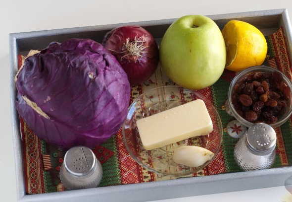 We will prepare all the products for making a festive garnish of red cabbage, apples and raisins.