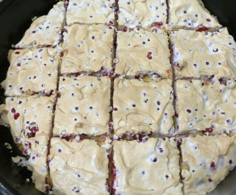 Cut the cooled meringue pie with red currants into about 19-20 pieces.