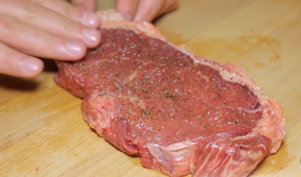 Next, the steak must be seasoned with salt and pepper. And also grease with olive oil and evenly grind the spices over its entire surface. Repeat the same procedure on the other side of the steak.