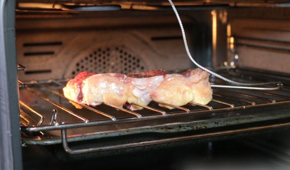 Place the probe of a culinary thermo in the middle of the steak in order to have a clear idea of its internal temperature. We send the steak to the oven on the wire rack to warm up at the lowest temperature. In my case, it is 130 degrees. We set the thermo to the desired temperature; today I want a medium, so I choose 60 degrees. We wait for the steak to warm up.