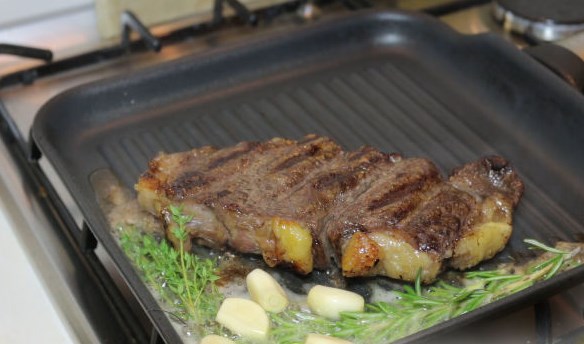 At this moment, the steak is prepared with additional flavors, and butter, a little vegetable oil (so that the butter does not burn), a sprig of rosemary, a few sprigs of thyme, and 5 cloves of garlic are sent to the pan. Pour the resulting aromatic oil over the steak using a spoon.