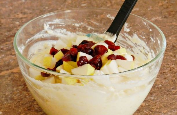 - Add pear and dried cranberries washed with hot water to the curd-rice mass. Mix.