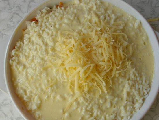 Fill the top with rice with fish and vegetables with cooked filling and sprinkle with grated cheese. We place the mold in the oven, preheated to 180 degrees. Cook the casserole for 35 minutes.