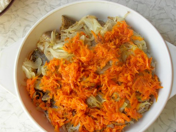 On the bottom of the dish, greased with vegetable oil, lay out the ingredients in the following sequence: boiled rice until half cooked, pieces of fish fillet, fried onions, fried carrots, and again rice.