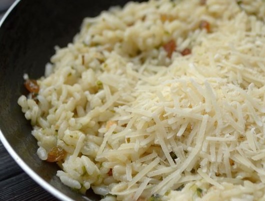 The last step is to sprinkle the risotto with raisins with finely grated Parmesan cheese, it is he who will most clearly reveal the taste and add a creamy note and aroma to the dish.