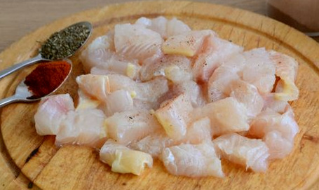 Cut the fish into approximately the same pieces. Sprinkle the fish slices with 1/3 of the salt, black pepper, paprika, and Italian herbs. Stir.