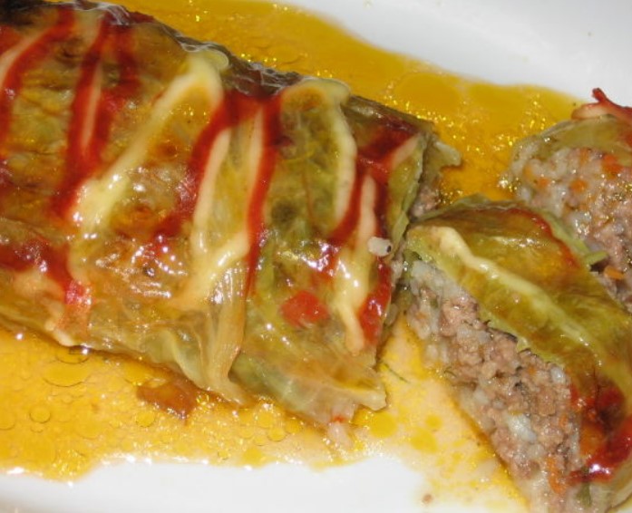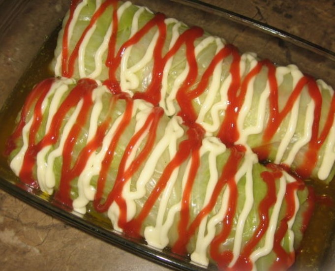 Transfer the minced meat rolls with cabbage to a baking sheet, pour 150 ml of salted broth. This is just half of the rolls. Lubricate the top with a mixture of ketchup and mayonnaise or apply a mesh from them. We put the baking sheet in the oven for 1 hour 10-15 minutes at a temperature of 175-180 degrees