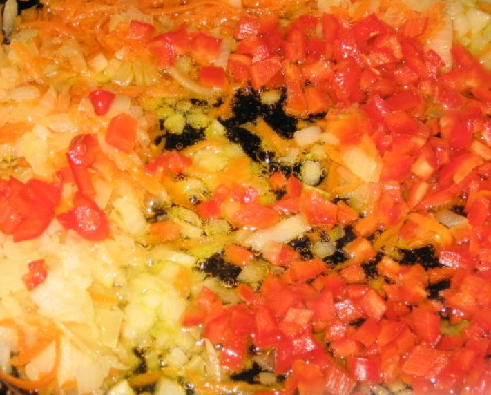 Boil rice for the filling. Finely chop the onion and rub the carrots on a coarse grater. Fry the onions and carrots in heated fat. Add to them red bell pepper cut into small cubes.