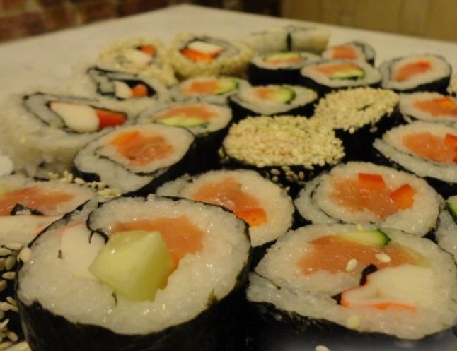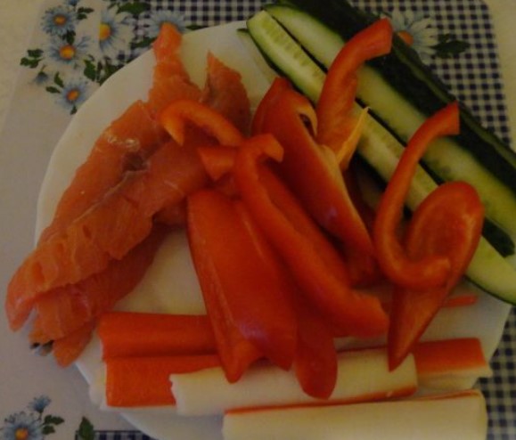 Cut the crab sticks, salmon, cucumber and bell pepper into small strips. Put cooked rice on sheets of nori seaweed, add strips of crab sticks, salmon, cucumber and bell pepper. Using a bamboo mat, roll everything into a roll.
