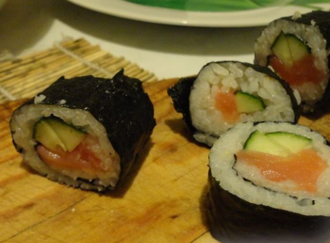 Cut the rolls with salmon and cucumber, after wetting the knife a little.