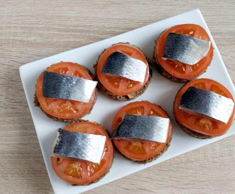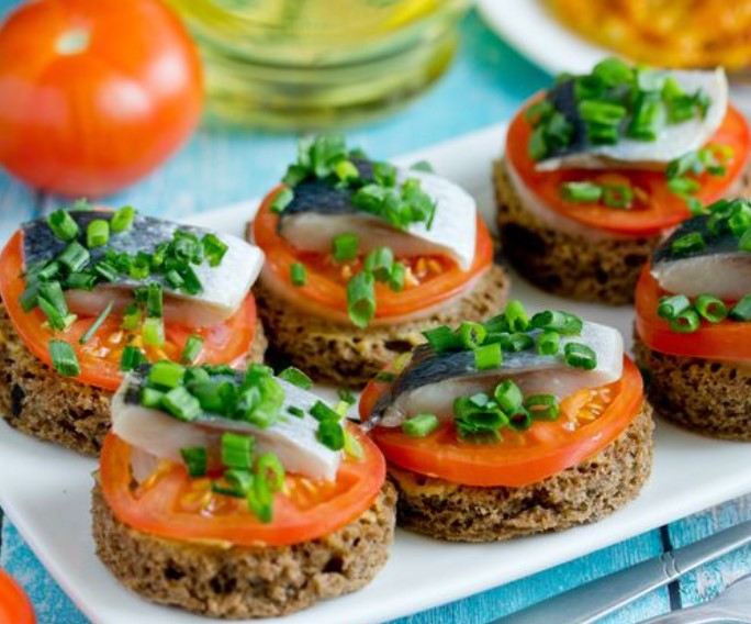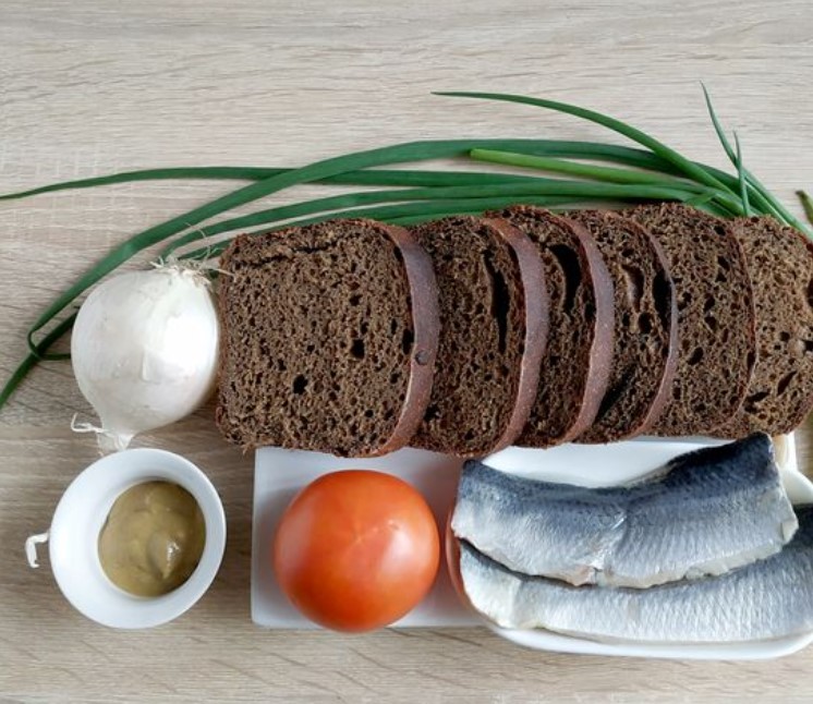 Herring sandwiches are in demand on the festive table; they are always a relevant and versatile snack. I suggest taking note of round rye bread sandwiches with mustard, onions, tomatoes and slices of salted herring fillets. The sandwiches are very tasty, they look smart and bright!