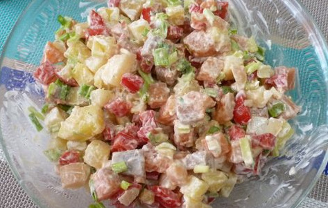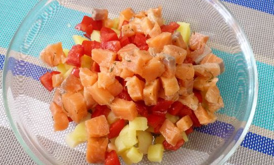 Set aside some of the dressing and fish for decoration. Then mix all the ingredients in a salad bowl and season with the prepared sour cream dressing. Add salt and pepper to taste.
