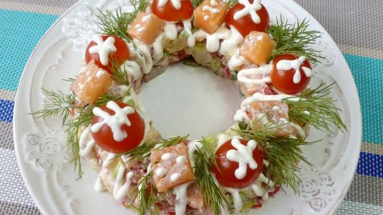 The salad with red fish and tomatoes turns out to be very tasty, hearty, beautiful, and perfect for a holiday. If you decorate the salad like New Year’s, then it will perfectly replace Olivier and decorate the table.